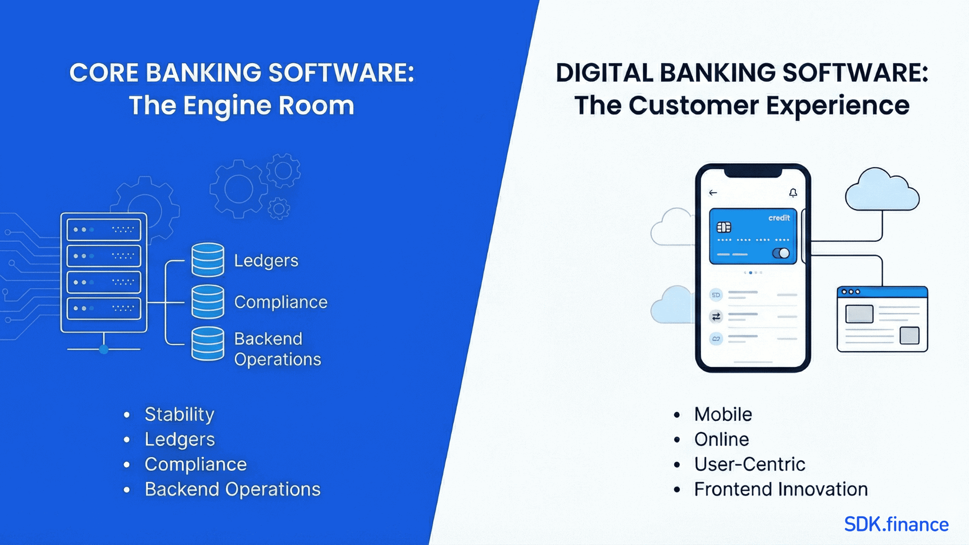 Core banking software and digital banking software solve different problems at different layers of the architecture. One guarantees financial integrity. The other enables adaptability and speed.
