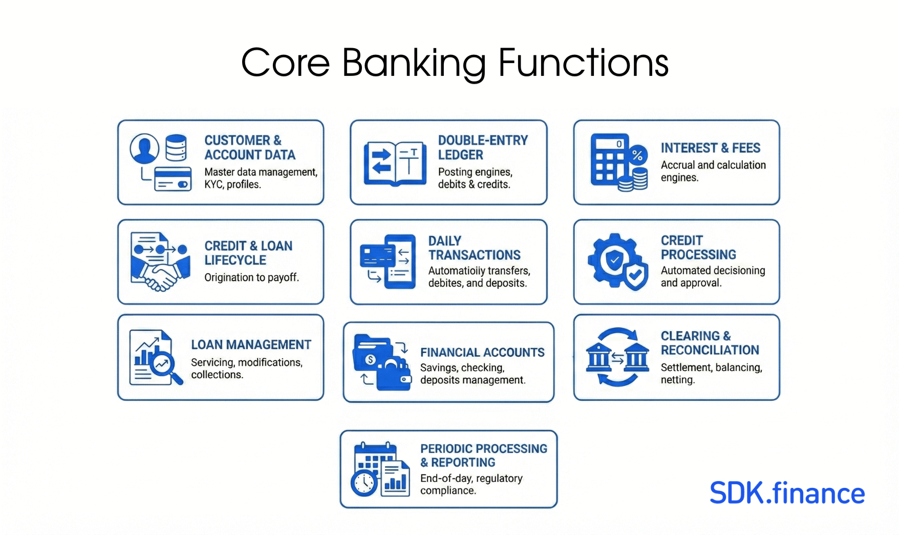 SDK.finance is designed as a white-label digital banking software layer built around a real-time ledger and positioned between core banking systems, payment infrastructure, and customer-facing channels.