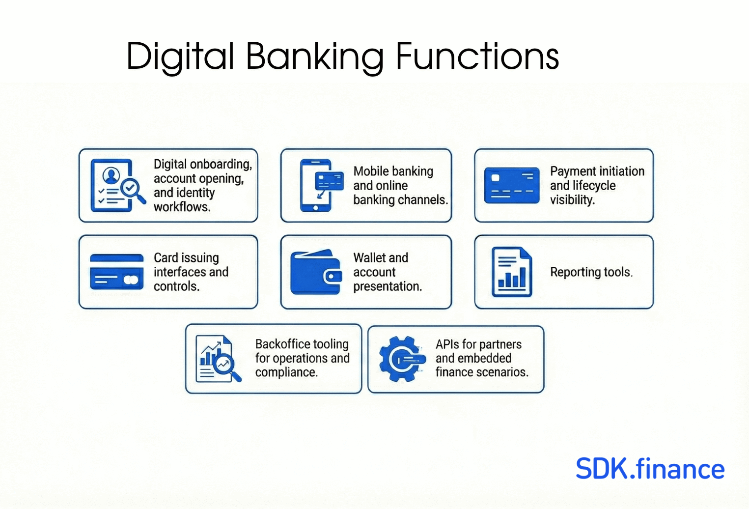 Digital banking software operates above the core and does not replace it. Its role is to expose financial services through digital channels in a controlled, scalable way.