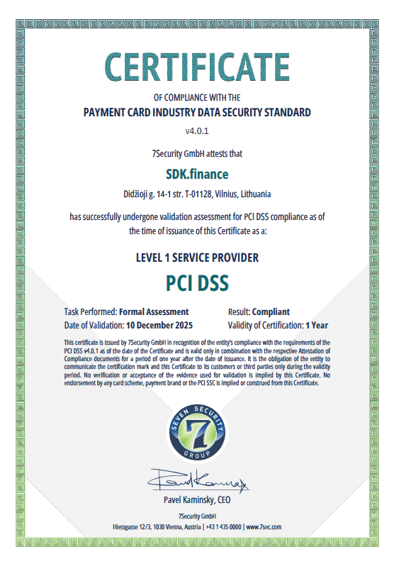 Big news – we’re pleased to share that SDK.finance has successfully completed its annual PCI DSS reassessment and is PCI DSS Level 1 certified under PCI DSS version 4.0.1, the latest version of the standard.