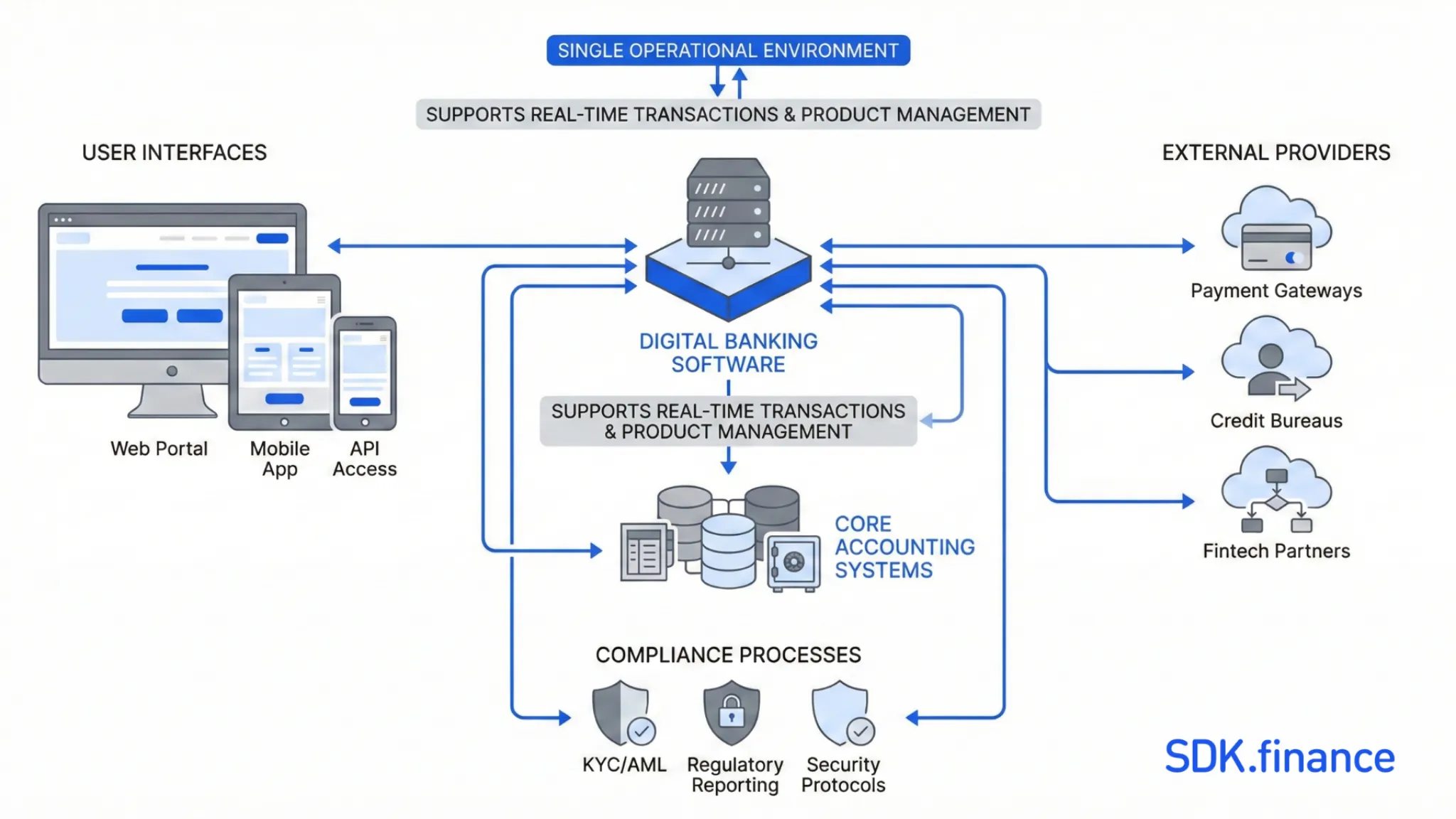 Digital banking software is the backend technology layer that enables banks and fintech companies to deliver financial services through digital channels. It connects user interfaces, core accounting systems, compliance processes, and external providers into a single operational environment that supports real-time transactions and product management.