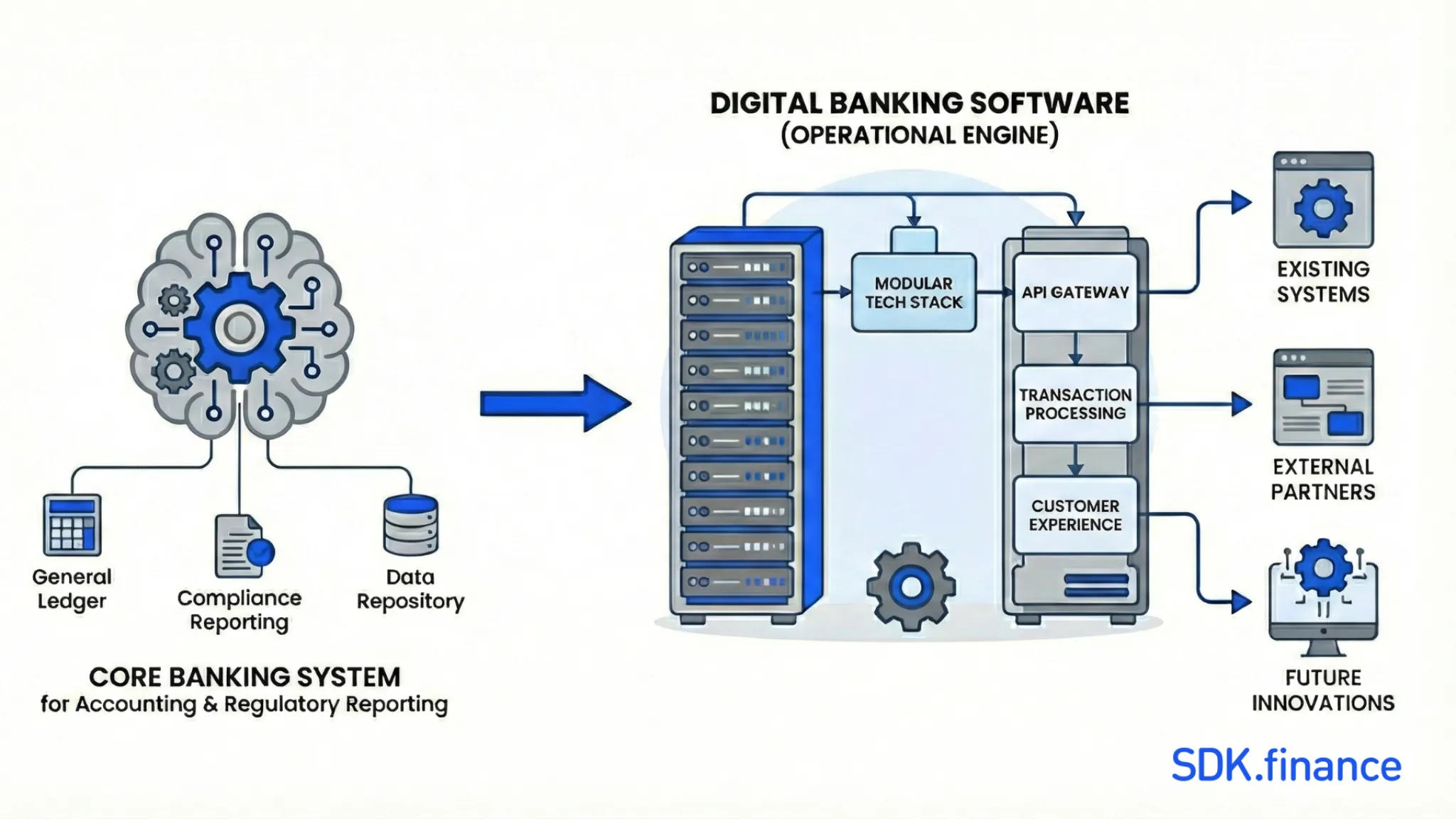 Modern 2026 architectures distinguish between the user-facing orchestration layer and the underlying ledger. Unlike traditional banking, which relies on legacy systems and manual processes, modern digital banking software providers leverage advanced technologies such as AI, automation, and cloud computing to deliver more efficient, secure, and user-friendly banking experiences.